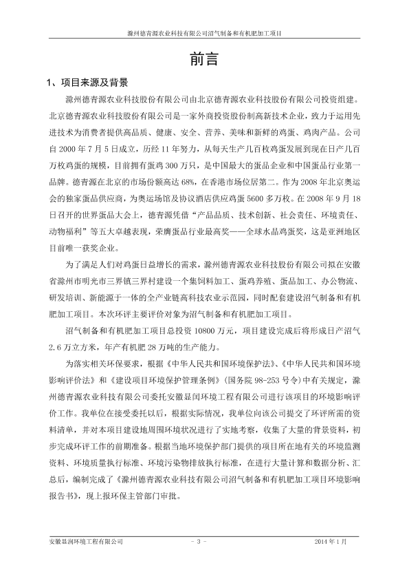 《滁州德青源农业科技有限公司沼气制备和有机肥加工项目环境影响报告书》受理公示