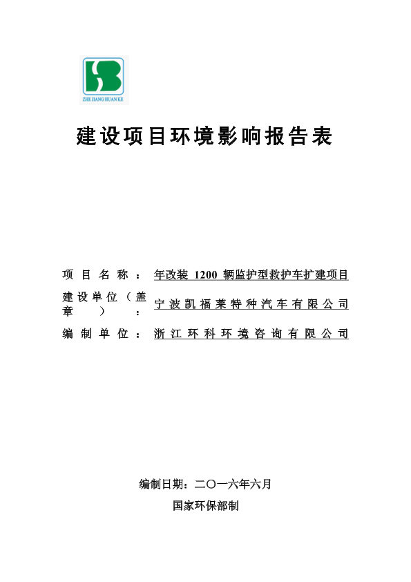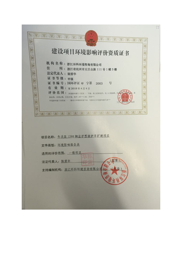 宁波凯福莱特种汽车有限公司年改装1200 辆监护型救护车扩建项目481394918