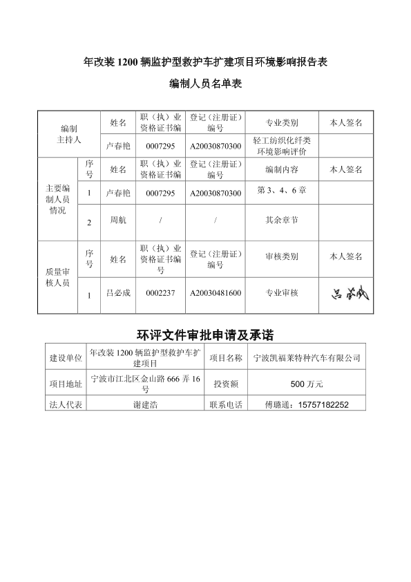 宁波凯福莱特种汽车有限公司年改装1200 辆监护型救护车扩建项目481394918.pdf