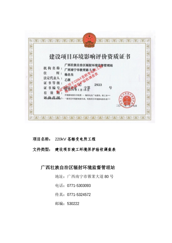 2、广西电网有限责任公司万秀220kv变电所建设项目环境保护设施竣工验收审批