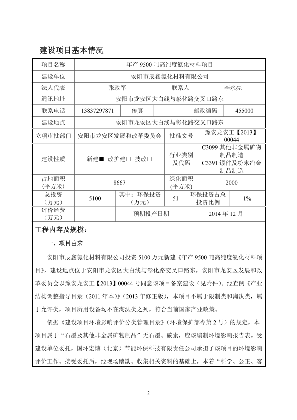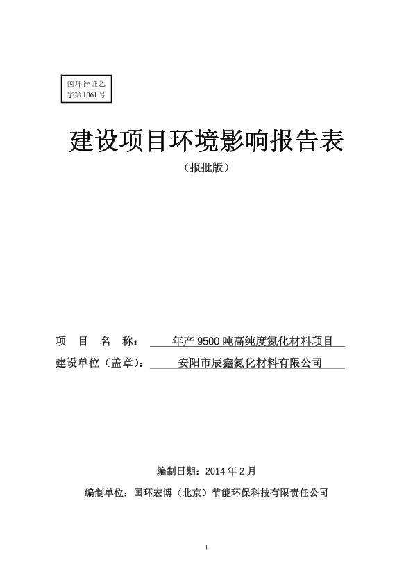 安阳市辰鑫氮化材料有限公司年产9500吨高纯度氮化材料项目环境影响报告表