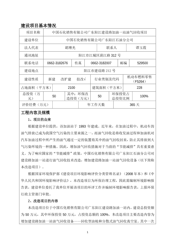 关于中国石化销售有限公司广东阳江建设路加油一站油气回收项目环境影响报告表