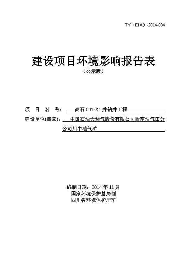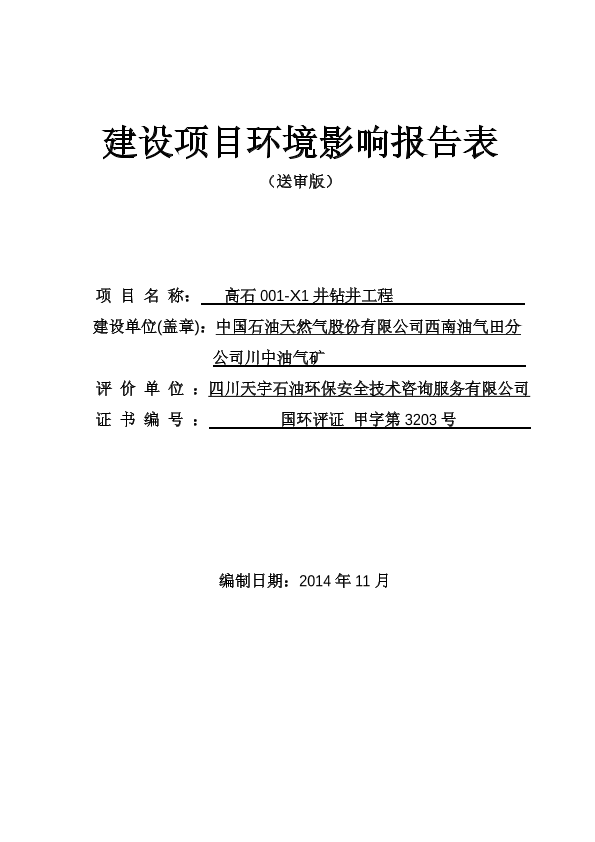 中石油天然气西南油气田分公司川中油气矿高石001-x!井钻井工程