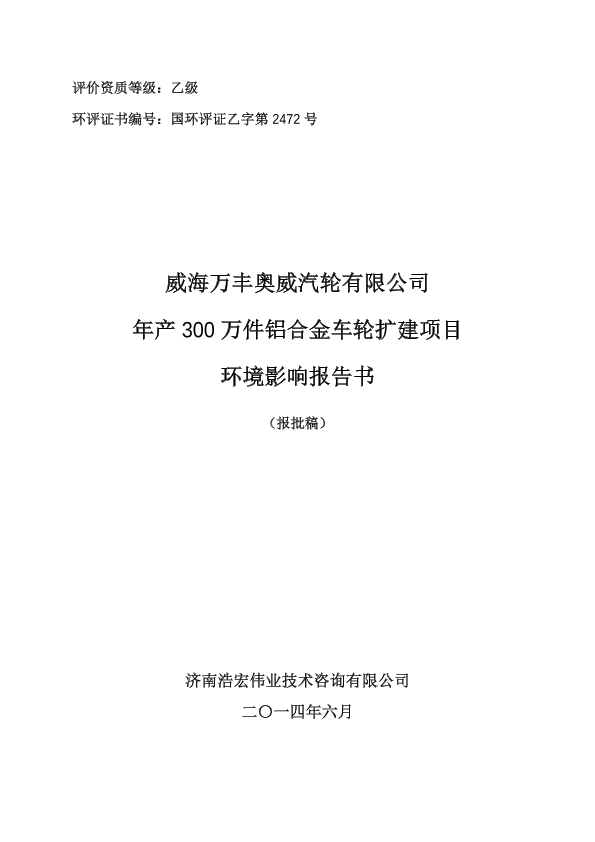 威海市环保局高区分局关于威海万丰奥威汽轮有限公司年产300万件铝合金车轮扩建项目环境影响报告书受理情况的公示_1228762.pdf