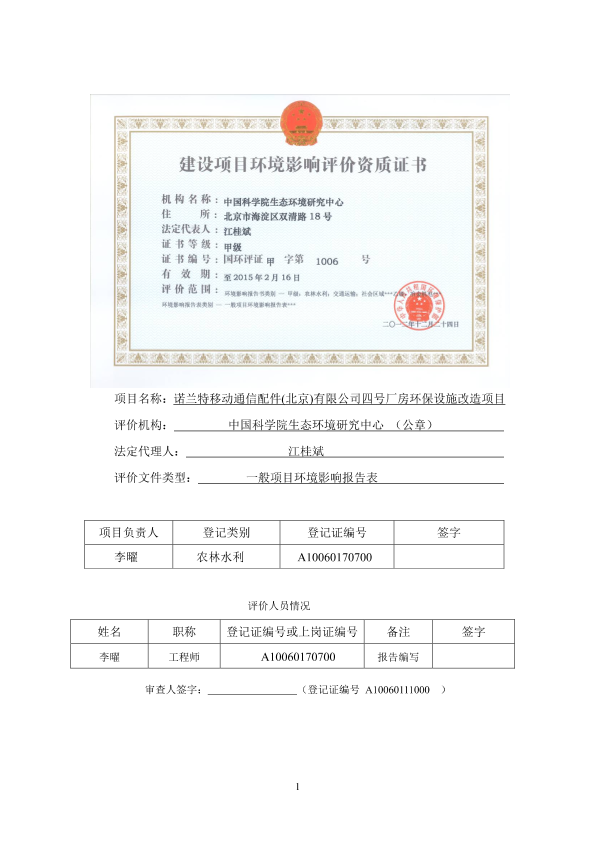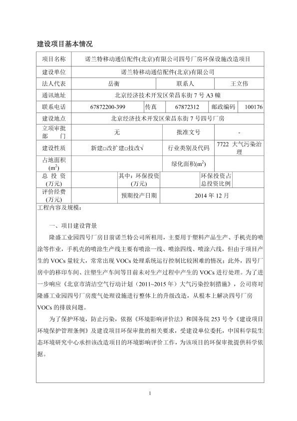 诺兰特移动通信配件(北京)有限公司四号厂房环保设施改造项目9982