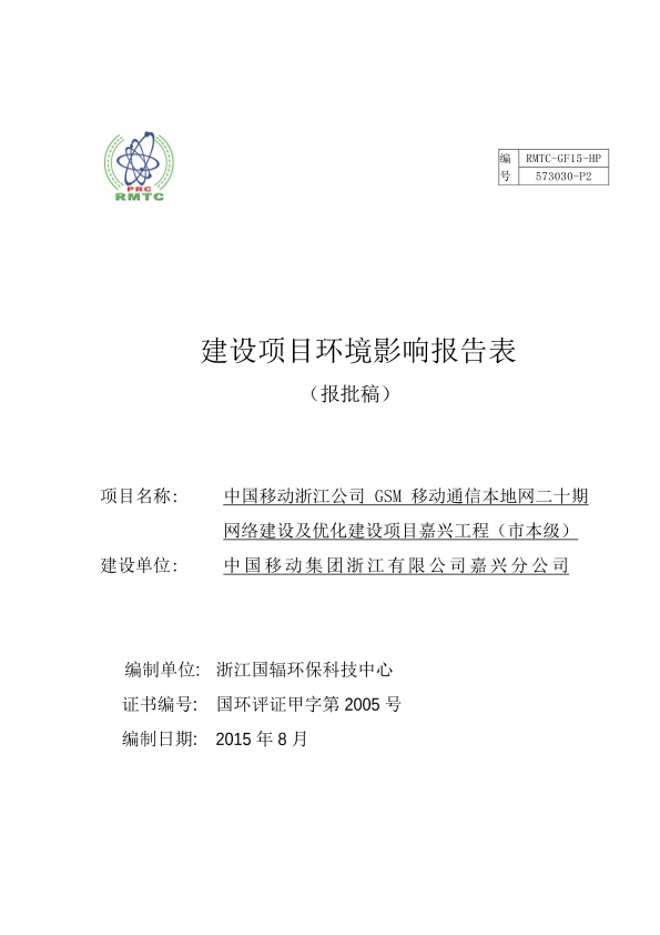 2015年10月29日受理环评文件的公告(中国移动浙江公司gsm移动通信本地网二十期网络建设及优化建设项目嘉兴工程(市本级)环境影响报告表)711087945