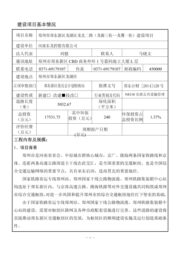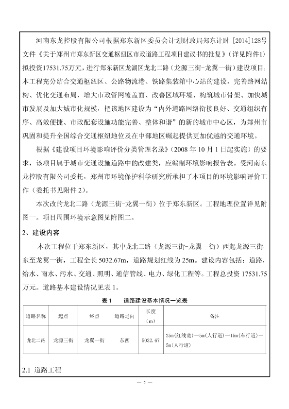 2、郑州市郑东新区龙湖区龙北一路道路工程(龙源二街-龙翼九街)建设项目