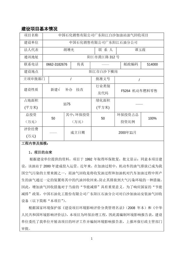 1、关于中国石化销售有限公司广东阳江聚宝加油站油气回收建设项目环境影响登记表