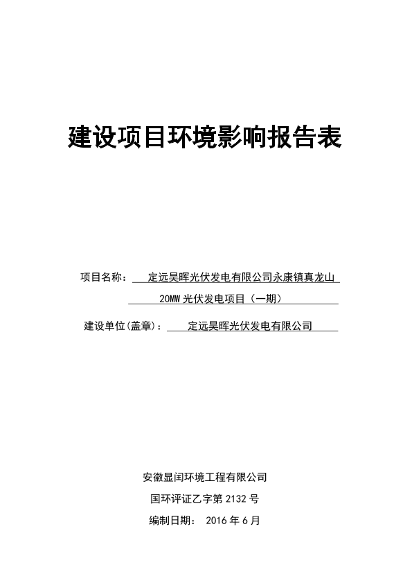 定远昊晖光伏发电有限公司《定远昊晖光伏发电有限公司永康镇真龙山20MW光伏发电项目(一期)》a91985a5240