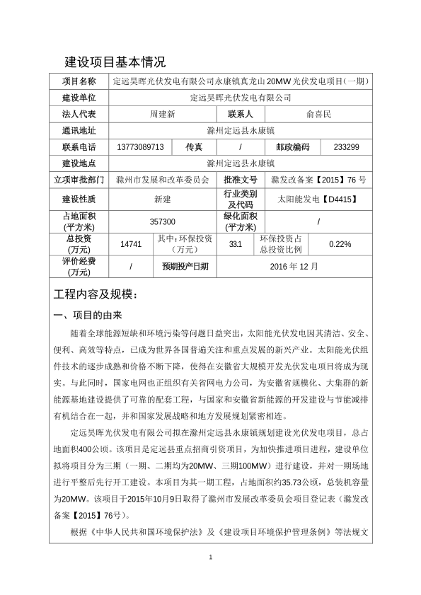 1、定远昊晖光伏发电有限公司《定远昊晖光伏发电有限公司永康镇真龙山20MW光伏发电项目(二期)》a14545a5240