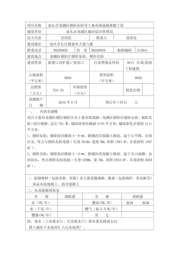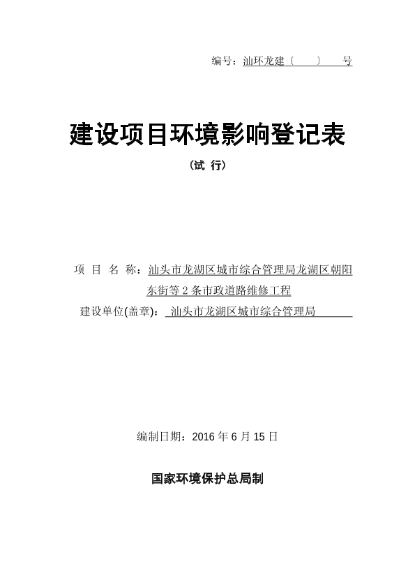 4、汕头市龙湖区城市综合管理局汕头市龙湖区城市综合管理局龙湖区丹阳街等5条市政道路维修改造工程项目环境影响登记表pdf