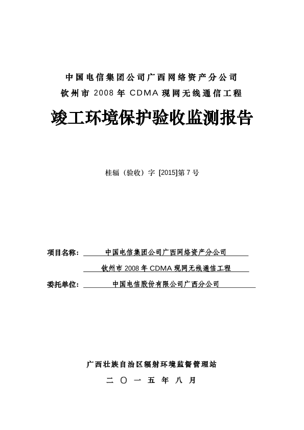 中国电信集团公司广西网络资产分公司钦州市2008年cdma现网无线通信工程环境保护设施竣工验收审批866024600