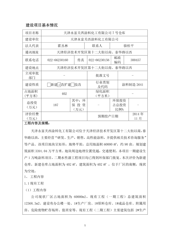 天津永富关西涂料化工有限公司7号仓库项目环境影响报告表受理情况8555
