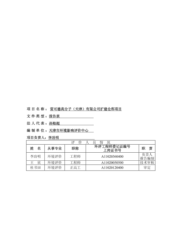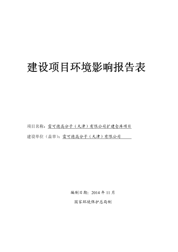 雷可德高分子(天津)有限公司扩建仓库项目环境影响报告表受理情况7062