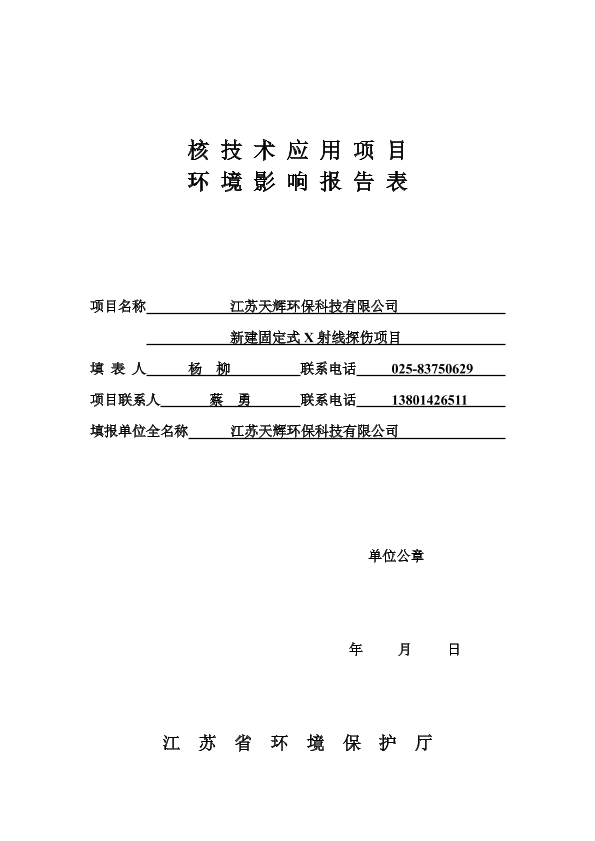 江苏天辉环保科技有限公司新建固定式x射线探伤项目报告表