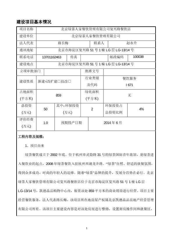 1、北京绿茶人家餐饮管理有限公司常营中路餐饮店项目9263
