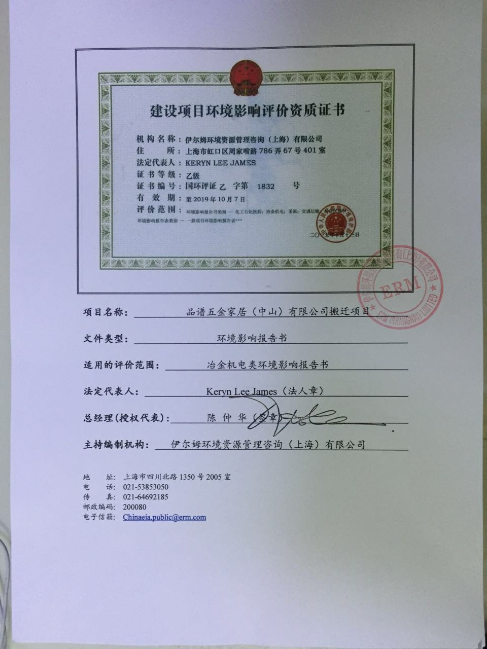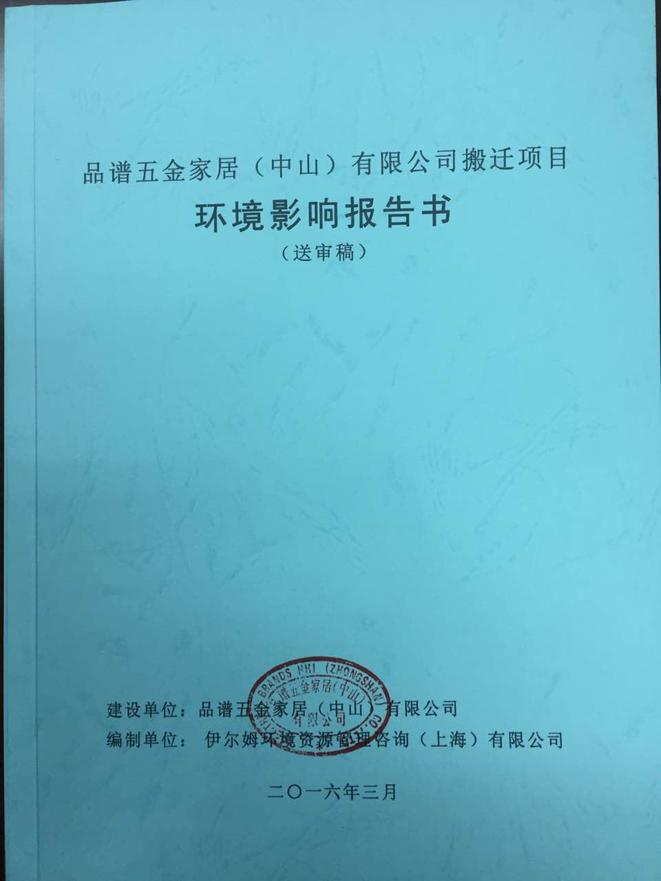 品谱五金家居(中山)有限公司环境影响报告书受理公示174161112