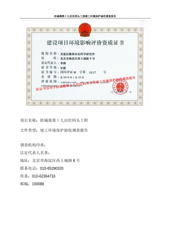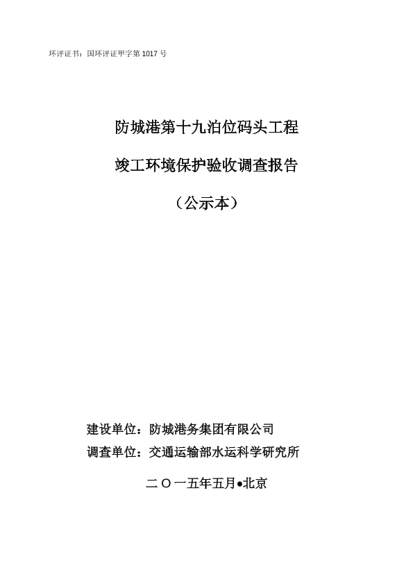 防城港务集团有限公司关于防城港第十九号泊位码头工程竣工环境保护验收573108593
