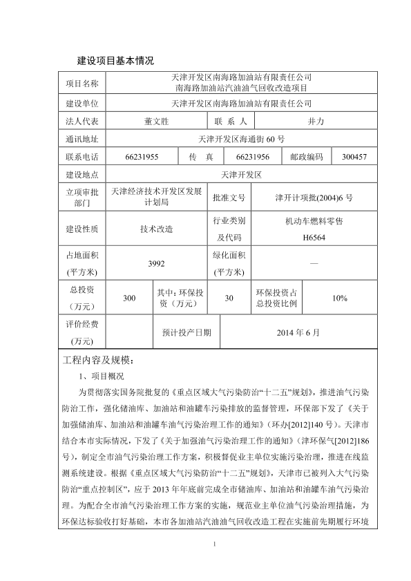 天津开发区南海路加油站有限责任公司南海路加油站汽油油气回收改造项目环境影响报告表受理情况公示-天津经济技术开发区环境保护局1813