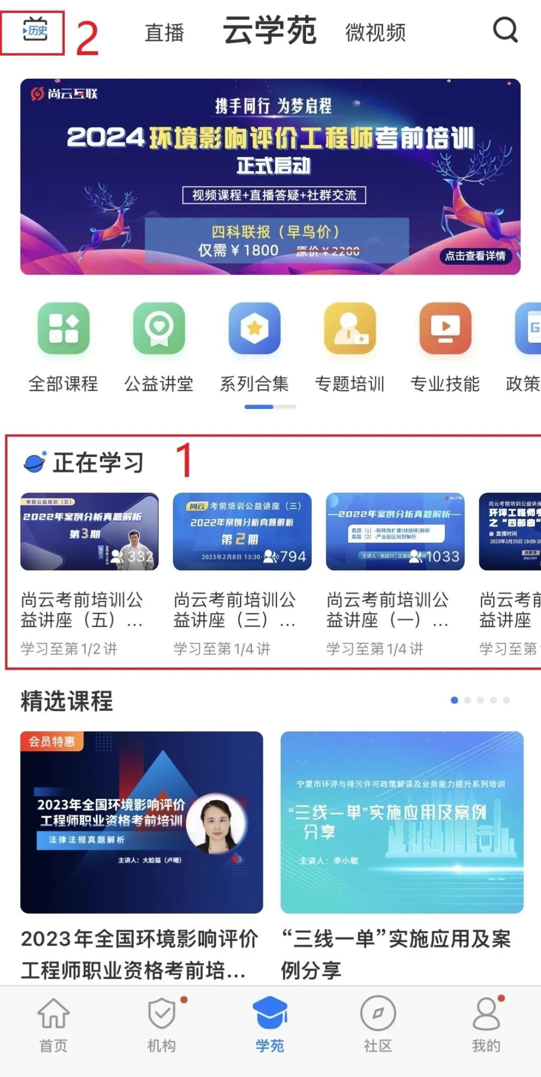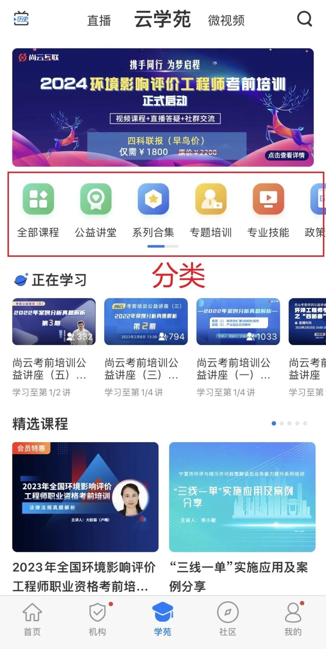 【环评云助手】自2020年8月全面推出[云学苑]-课程·直播·视频功能以来,一直致力于从单一的行业法规条文查询工具,到集文字、视频、社区为一体的多元化、综合型交流学习平台转型。截至2023年7月31日,[云学苑]已累计上线课程340门,直播390场,为2.3万学员提供了线上学习机会。