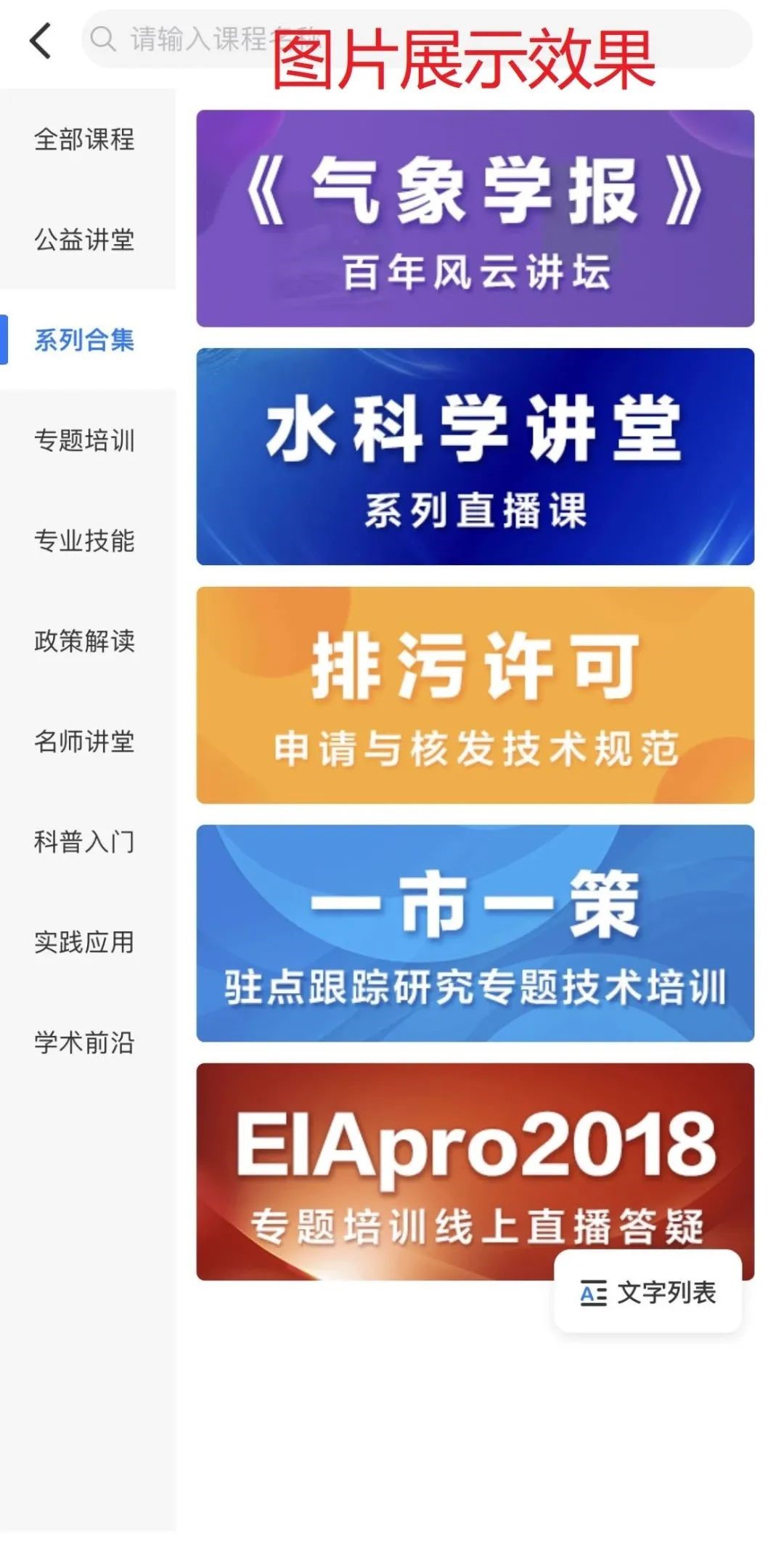 当然本次改版最大的亮点在于新增了“系列合集”、“专题培训”。[云学苑]上线至今,已收录多个合集,每个合集下分布有十几到几十门课程,并在持续更新中。“系列合集”、“专题培训”两个功能,可以让用户一键直达该合集/培训下的所有课程,包括《排污许可证申请与核发技术规范》、《尚云环评工程师考前培训》系列课程等等,更有助于系统学习。图片、文字两种展示方式,充分考虑到不同用户使用习惯。