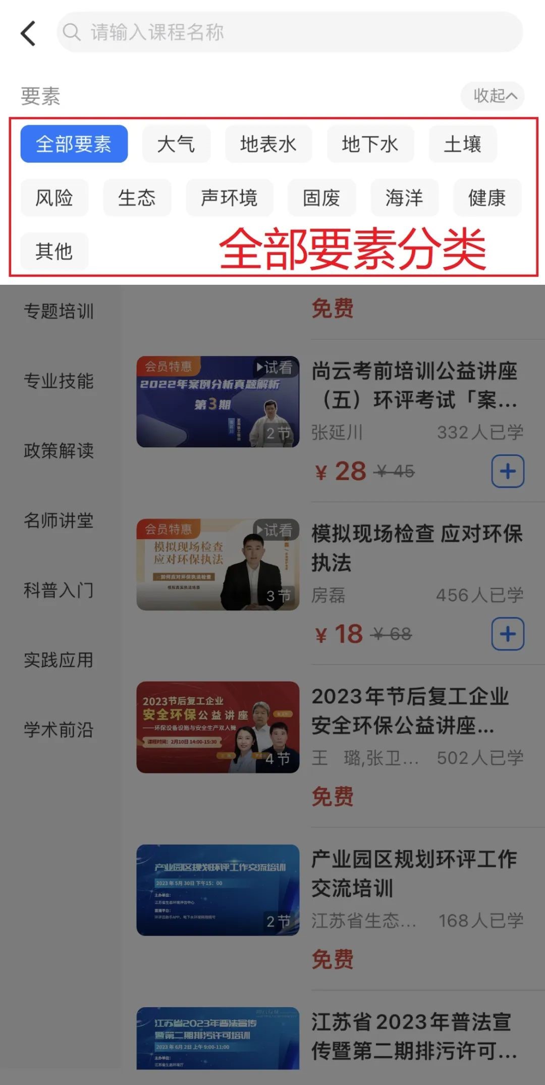 此次升级对所有课程按“要素、主题”进行了重新归类,要素包括大气、地表水、地下水、土壤、风险等11项;主题包括环境评价、环境监测、竣工验收、排污许可、环境管理、环境规划等14个类别,几乎涵盖了所有环境行业从业者常用分类,不管是管理人员、科研人员还是一线从业者,都可以从这里快速筛选自己想要的内容。