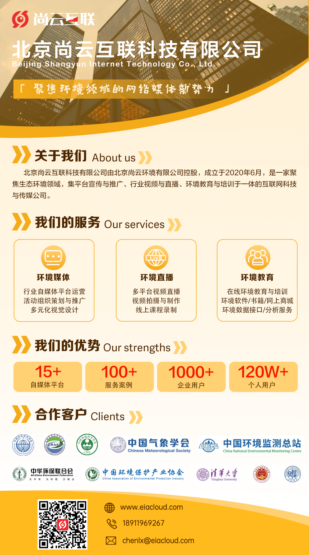 北京尚云互联科技有限公司(简称“尚云互联”)由北京尚云环境有限公司控股,成立于2020年6月,是一家聚焦生态环境领域,集平台宣传与推广、行业视频与直播、环境教育与培训于一体的互联网科技与传媒公司。