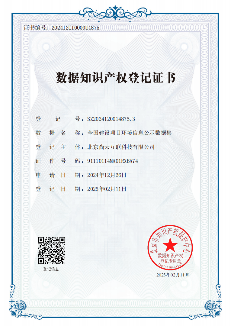 2025年2月16日,北京尚云互联科技有限公司(以下简称“我公司”)成功申请“全国建设项目环境信息公示数据集”数据知识产权登记证书,这标志着我公司在环境数据领域的技术创新和知识产权保护方面取得重要突破。