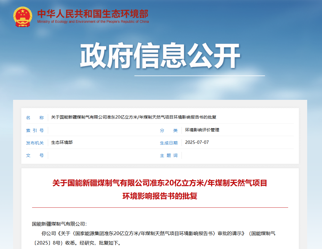 2025年7月4日,生态环境部正式批复《国能新疆煤制气有限公司准东20亿立方米/年煤制天然气项目环境影响报告书》,标志着这一国家级能源化工战略项目取得关键进展,对国家能源安全具有重大战略意义。批复文件中明确指出:“项目符合国家现代煤化工建设项目环境影响评价文件审批原则,对服务国家能源安全、加强煤炭清洁高效利用、推进现代煤化工与“绿电”“绿氢”等产业耦合具有积极意义。同时,项目也须严格落实各项污染防治措施和环境风险防范措施,确保环境质量持续改善。”