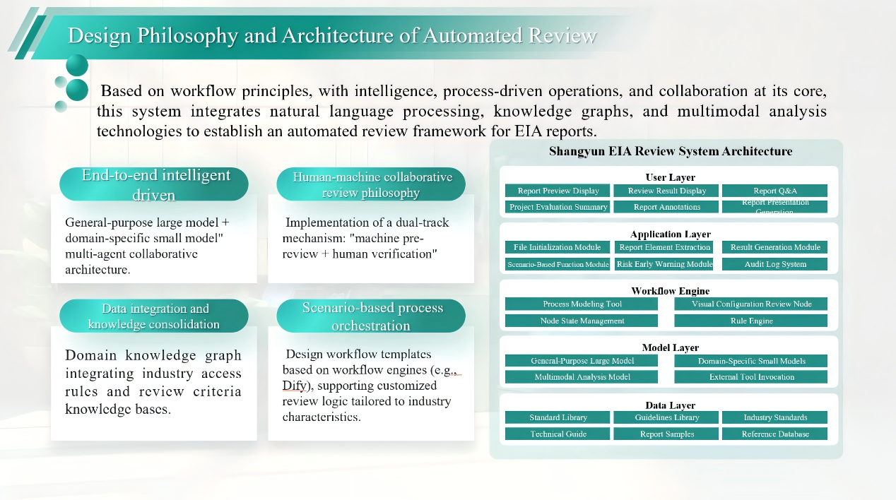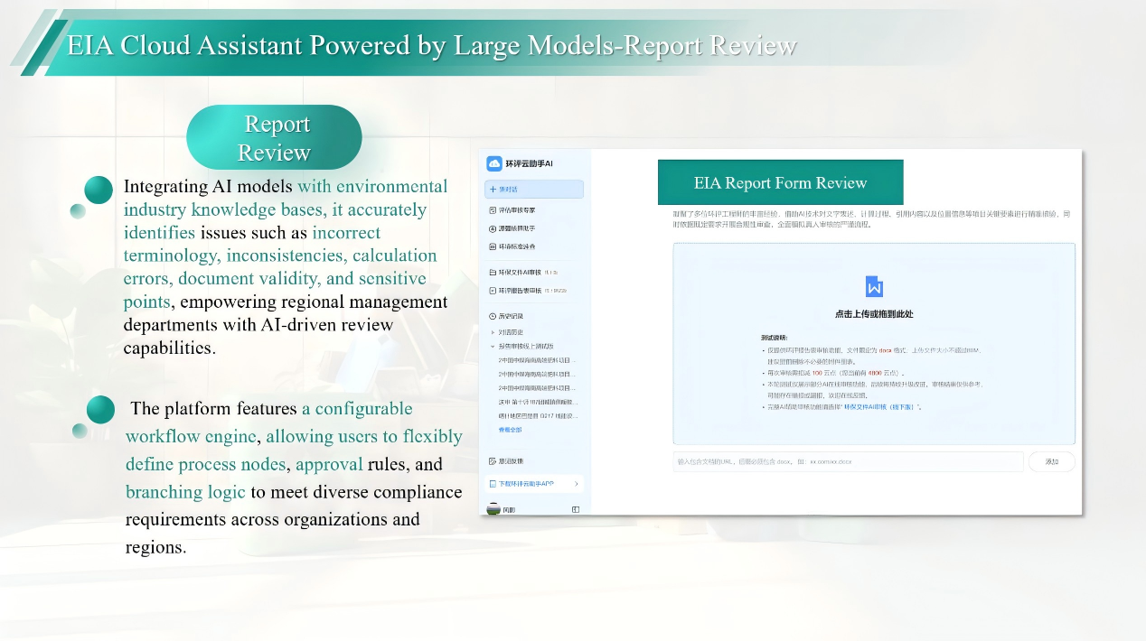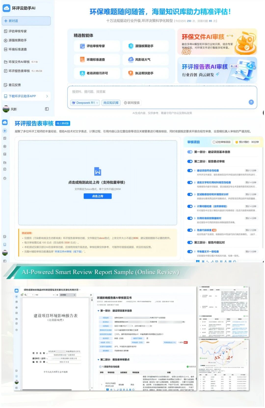此外,丁峰还现场展示了尚云环境自主研发的“环评云助手AI平台”(AI.EIACloud.com)及其在环境知识库构建、智能问答以及环评报告智能审核等场景中的实际应用。该平台基于DeepSeek大模型与环保行业知识库,实现了从AI智能问答到报告在线审核的全流程AI赋能,显著提升了AI辅助环境管理的效率与精准度。