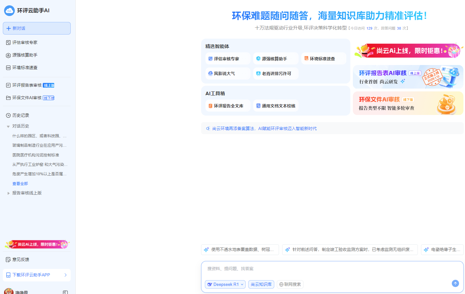 全新推出的尚云AI平台已上线核心产品包括AI对话、AI搜索、5大环保智能体、环评报告表审核(线上版)、环保文件AI审核(线下版),同时有两项重要功能:环评报告全文库AI检索查询、通用文档文本校核也已进入最后的内测阶段,将于近期与大家见面。