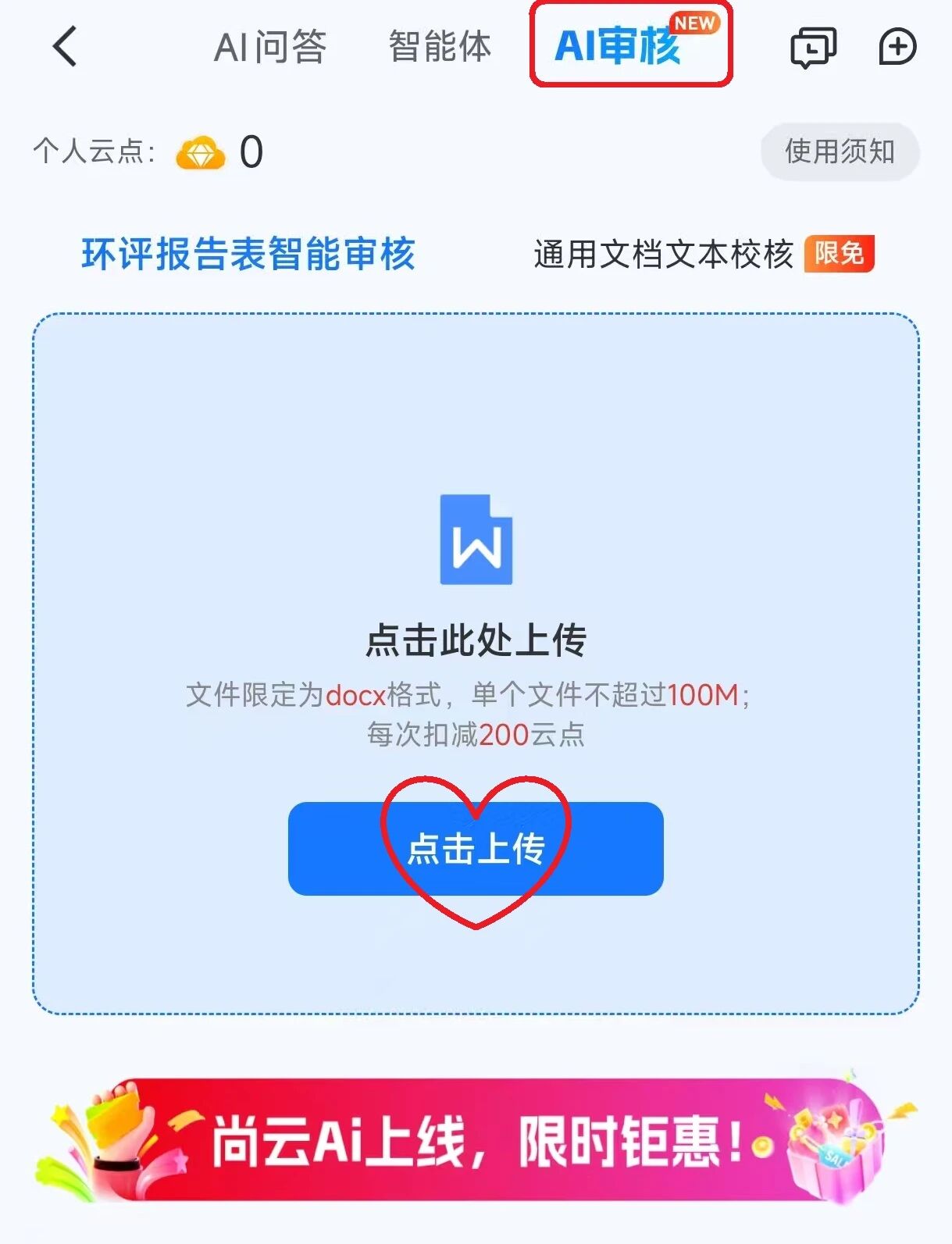 打开环评云助手APP → 首页点击AI问答/AI+ →点击AI审核, 即刻开启尚云AI智能服务▼